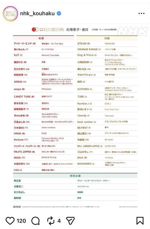 NHKは19日、大みそかの第76回NHK紅白歌合戦(後7時20分)の曲目を発表した。 初出場組からは「M!LK」が今年を象徴するヒット曲「イイじゃん」、HANAは「ROSE」、「KAWAII